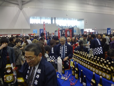 ステージでは酒蔵の法被を着た若い女性(手にはもちろんその酒蔵の一升瓶)のファッションショーや利き酒大会が行われています。