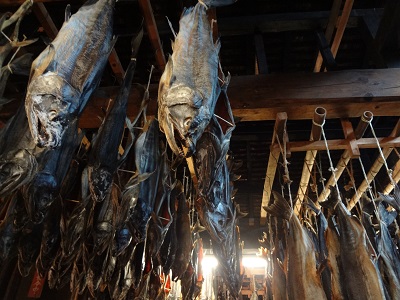お店の奥では天井の梁から1000匹以上の鮭が吊るされています。