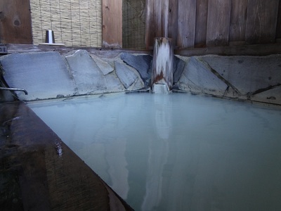 宿のお風呂には白濁した硫黄泉が滔々と注がれています。