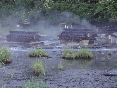宿のすぐ近くには源泉が噴き出しおり、あたりは硫黄臭がしています。