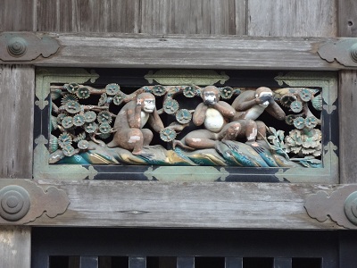 日光東照宮の建物には沢山の木彫像があり、これは有名な「見ざる、言わざる、聞かざる」の三猿で、猿の成長を描いた彫刻の一部です。